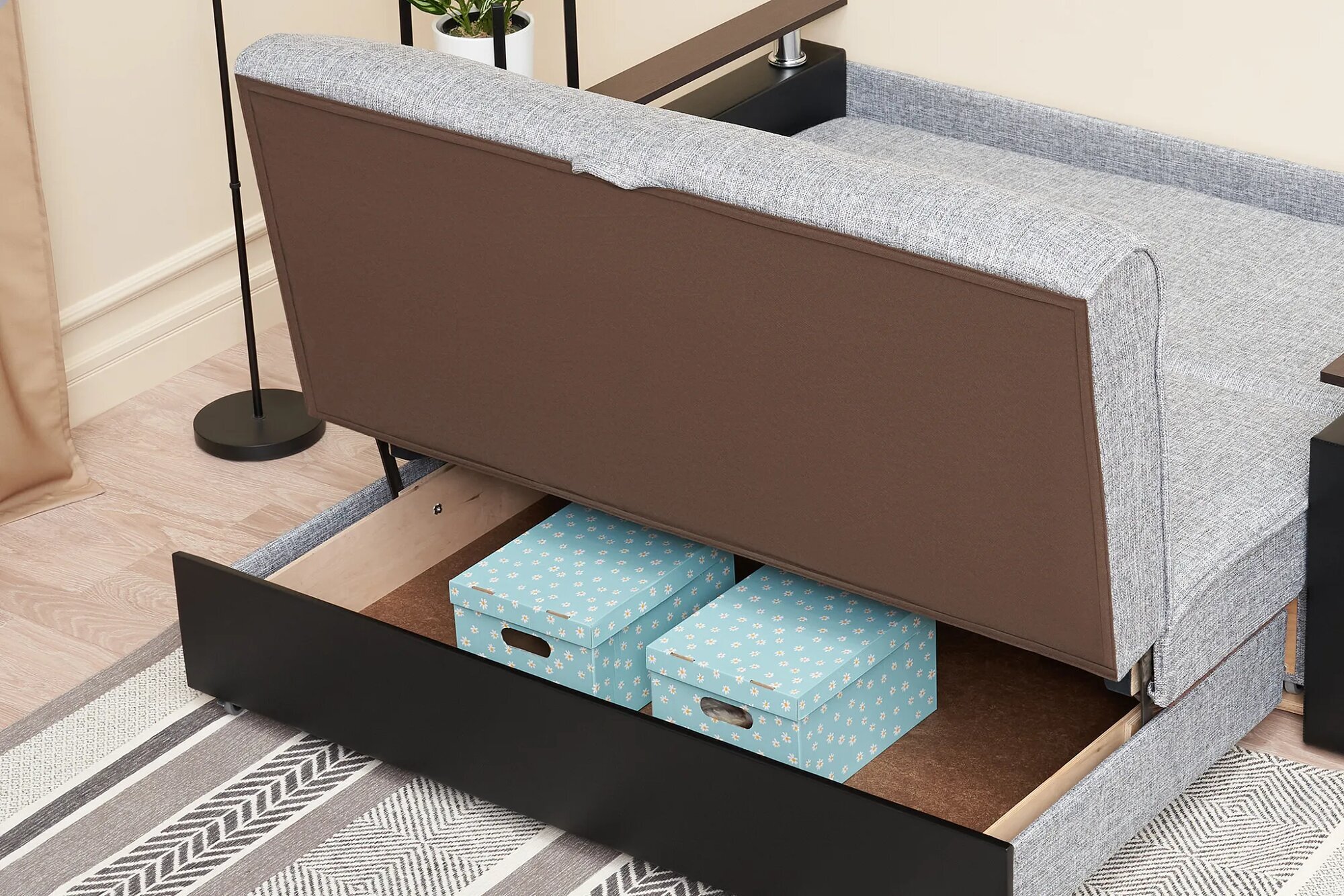 Диван-кровать Сантана оснащен ящиком для белья, что позволяет экономить пространство и поддерживать порядок в вашем доме. Наполнитель из пенополиуретана обеспечивает мягкость и комфорт при использовании.