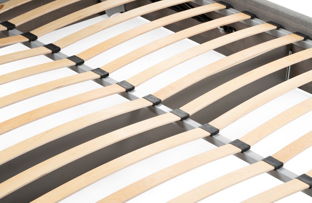 Основание кровати выполнено из ламелей, что обеспечивает дополнительную поддержку матраса и улучшает качество сна.