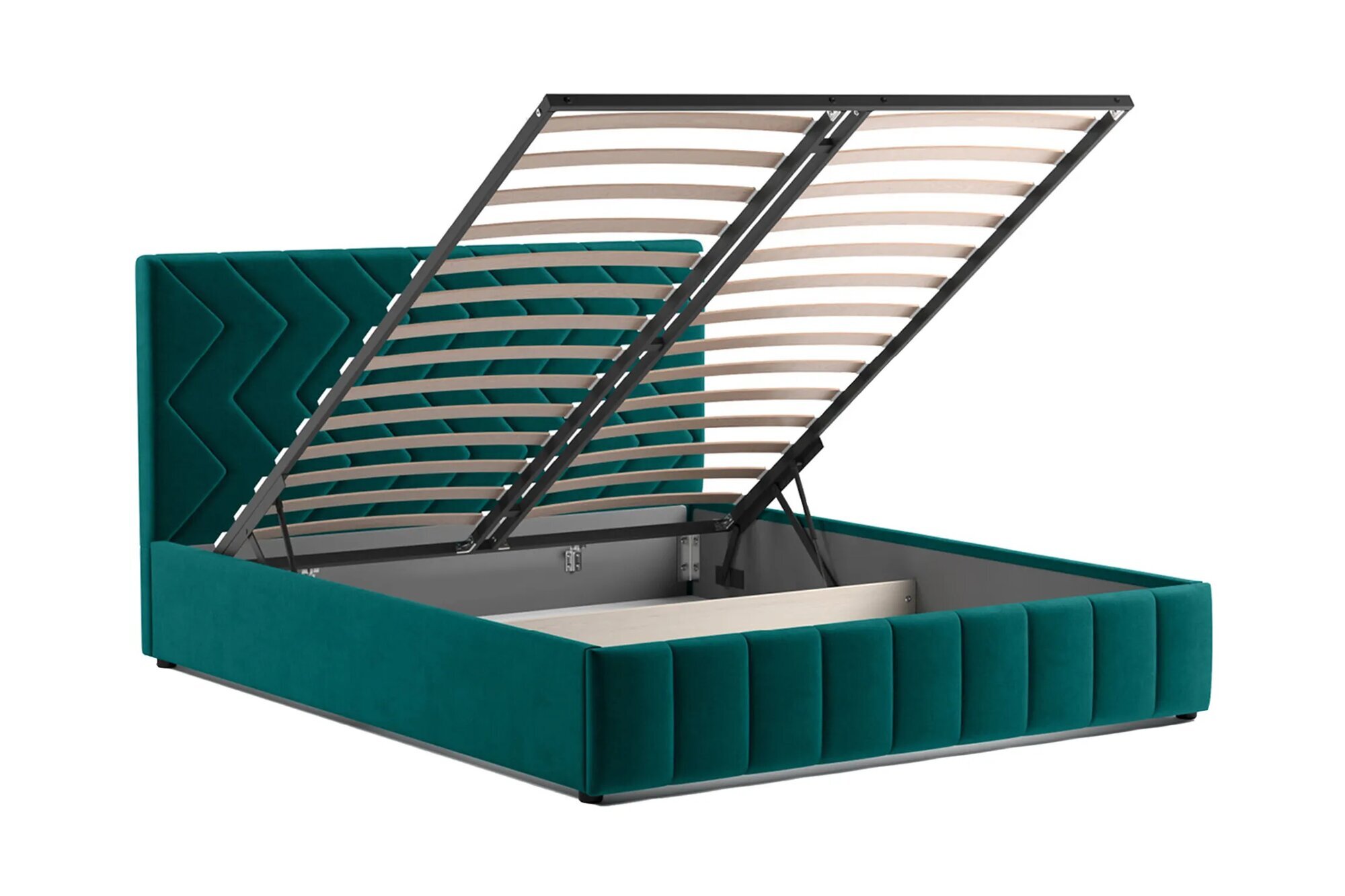 Кровать выполнена из качественных материалов: каркас из ДВП, ДСП и ЛДСП, а обивка из велюра. Велюр - это мягкий, приятный на ощупь материал, который не вызывает аллергии и прост в уходе. Изумрудный цвет кровати добавит уют в вашу спальню и будет гармонировать с любым интерьером. Модель оснащена подъёмным механизмом и просторным местом для хранения вещей. Допустимая нагрузка на дно бельевого короба 10 кг.