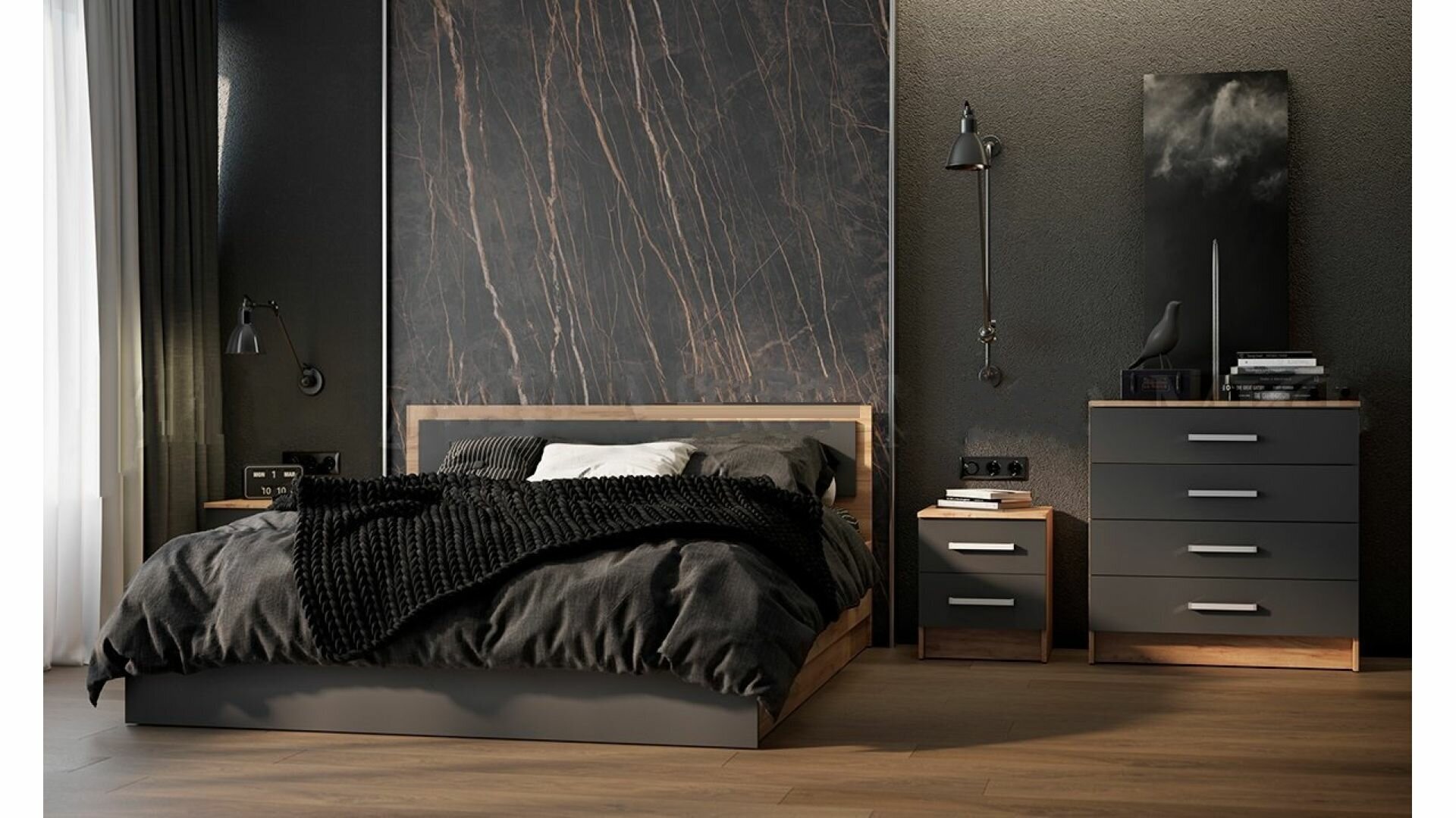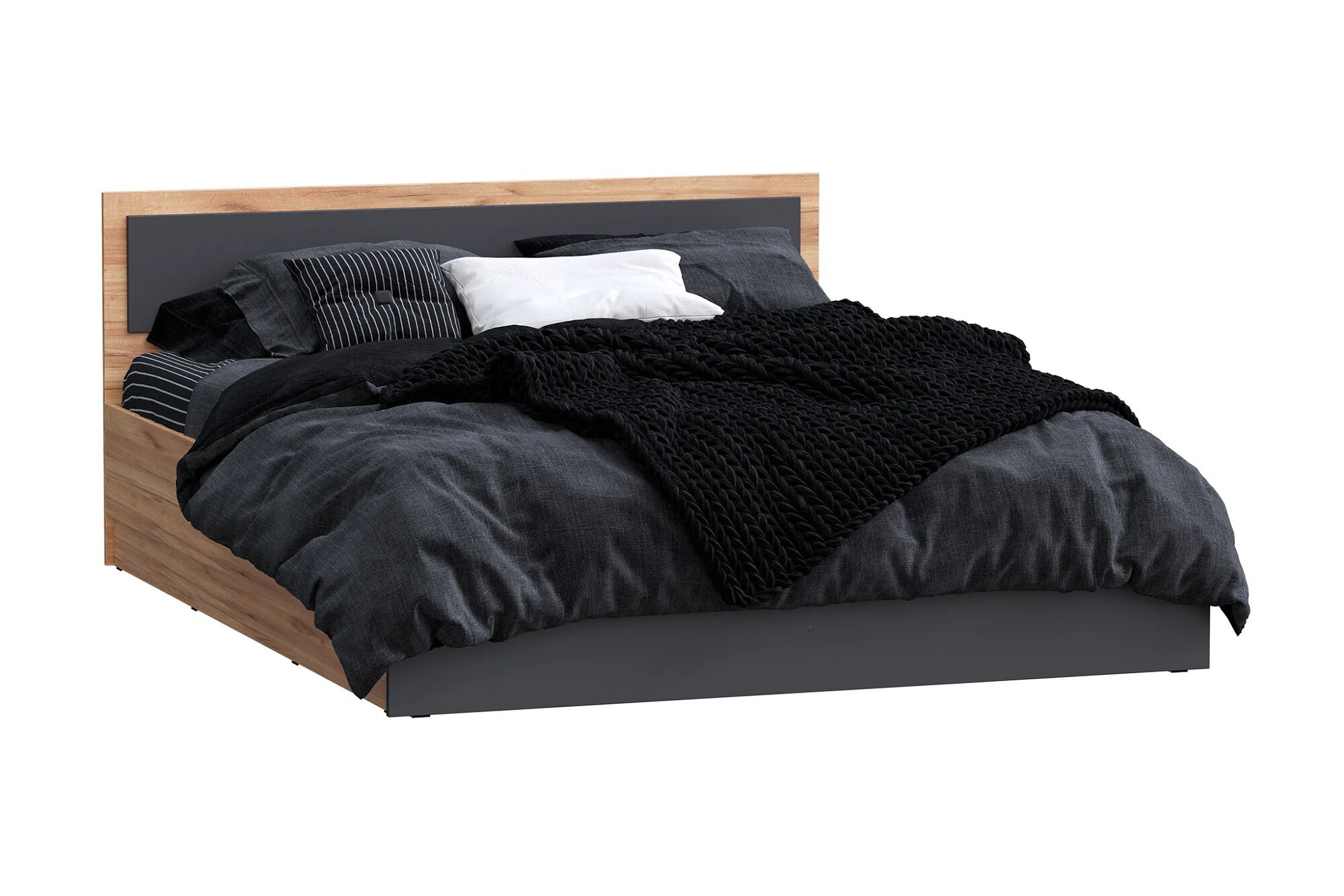 Кровать выполнена в двух цветах, что позволяет ей гармонично вписаться в любой интерьер. Материал каркаса - ЛДСП, обеспечивающий прочность и долговечность конструкции.