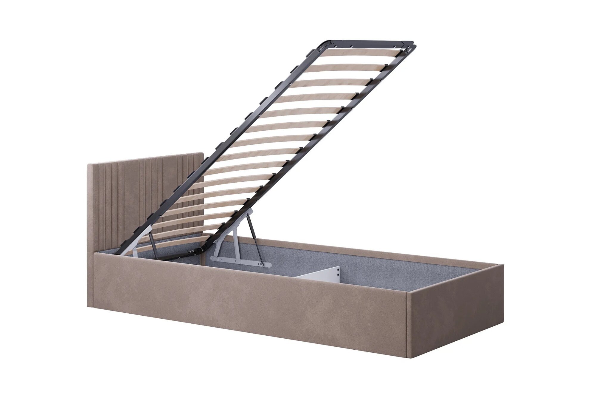 Кровать Поло оснащена удобным подъемным механизмом, который позволяет экономить пространство в комнате и обеспечивает быстрый доступ к вместительному ящику для хранения.