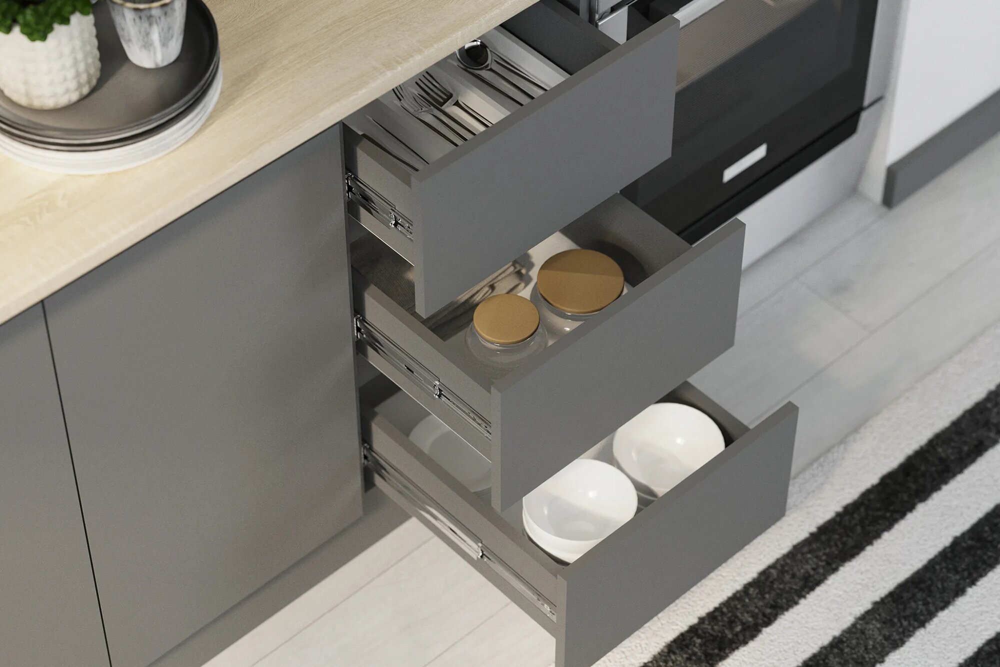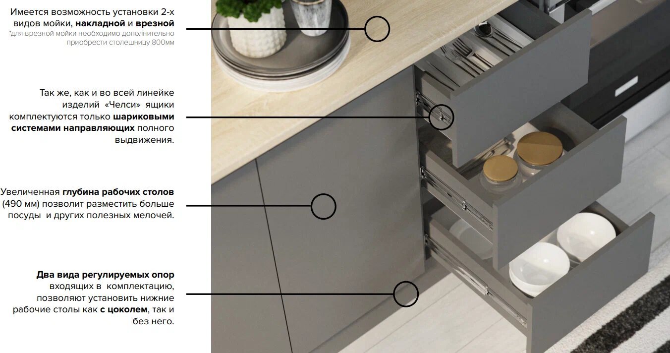 Ножки шкафов регулируются, что позволяет легко настроить их высоту для максимального комфорта. Тип направляющих - шариковая, что обеспечивает плавное и бесшумное открывание ящиков и шкафов.