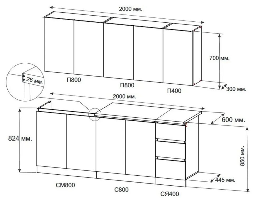 Габариты кухни: ШВ 400 - 40 х 71.8 х 30 см - 1 шт., ШВ 800 - 80 х 71.8 х 30 см - 2 шт., Низ (ШхВхГ): ШН 800 - 80 х 84.6 х 51 см - 1 шт., ШНМ 800 - 80 х 84.6 х 50.6 см - 1 шт., ШН3Я 400 - 40 х 84.6 х 51 см - 1 шт. Столешница 80 см - 1 шт., Столешница 40 см - 1 шт.
