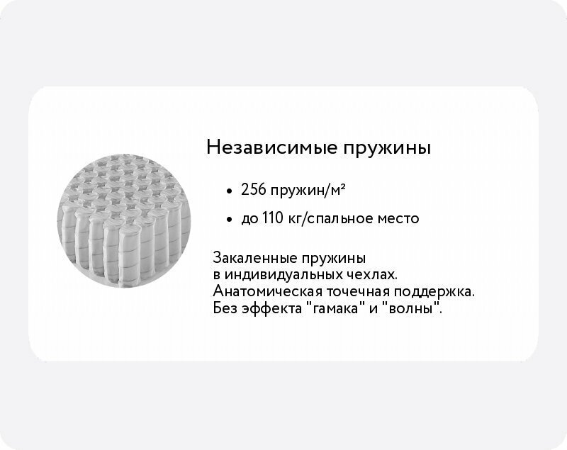 В качестве основы в матрасе используется независимый пружинный блок. Такие пружины точечно воспринимают нагрузку: сжимаются только те пружины, на которые направлена нагрузка, а остальные остаются в состоянии покоя. Благодаря этому у матраса есть анатомические свойства, которые обеспечивают равномерную поддержку тела во время сна. Матрас помогает восстановиться после тяжелого дня.