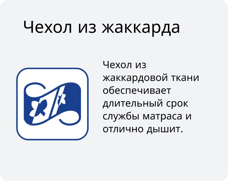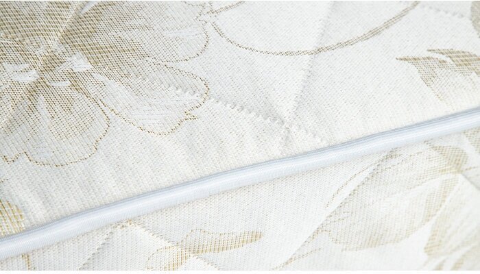 Верхний чехол сделан из прочного синтетического жаккарда, состоящего из синтетических материалов с добавлением нитей из натуральных тканей с особым переплетением волокон.. Он обладает хорошей воздухопроницаемостью, устойчив к деформациям и обладает гипоаллергенными свойствами.