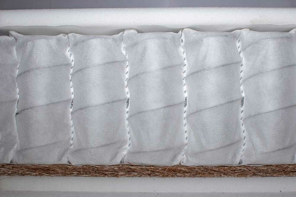 В основе данной модели - блок независимых пружин - TFK (250 пружин на кв.м.), где каждая пружина заключена в отдельный чехол из спанбонда. Такая конструкция предотвращает появление эффекта гамака, а так-же способна справится в разницей в весе спящих - более 25 кг. Внешние слои наполнителей матраса отделены защитным слоем термовойлока, который защищает материал от губительного воздействия, связанного с работой пружинного блока. Сторона А - характеризуется высокой степенью анатомичности, за счёт слоя из искусственного латекса. Сторона Б - представляет собой сочетание искусственного латекса и материала Poly Refine, последний в свою очередь обеспечивает ярко выраженную поддержку позвоночнику, а так-же более равномерно распределяет нагрузку на пружинный блок.