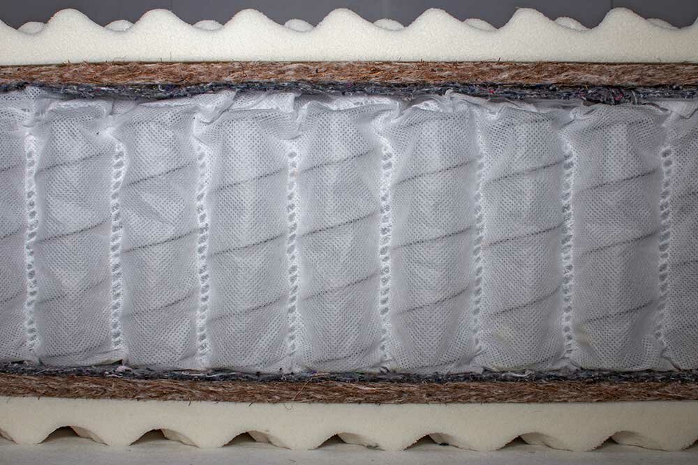 Для придания жесткости матраса используются слои из кокосового волокна. Они размещены по обе стороны пружинного блока. Материал экологически чистый. Он хорошо поглощает и прогоняет по всему периметру воздух, благодаря чему в матрасе не накапливается пыль.