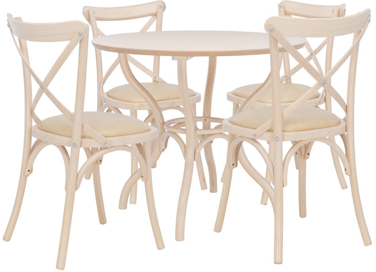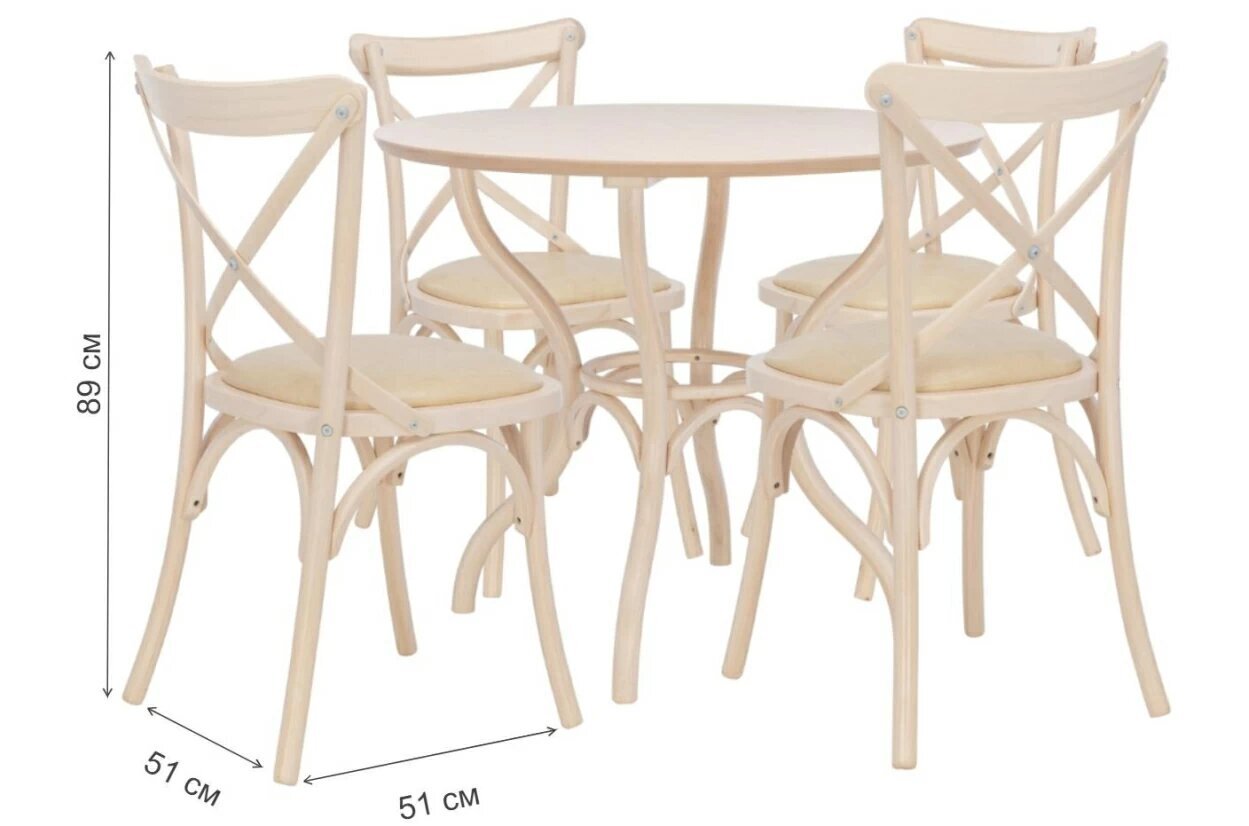 Обеденная группа Leset Тор оснащена круглой столешницей диаметром 89 см, что позволяет разместить за столом до 4 человек. Глубина сиденья составляет 51 см, а ширина – 51 см. Высота стола – 75 см, что обеспечивает комфортное размещение за столом.