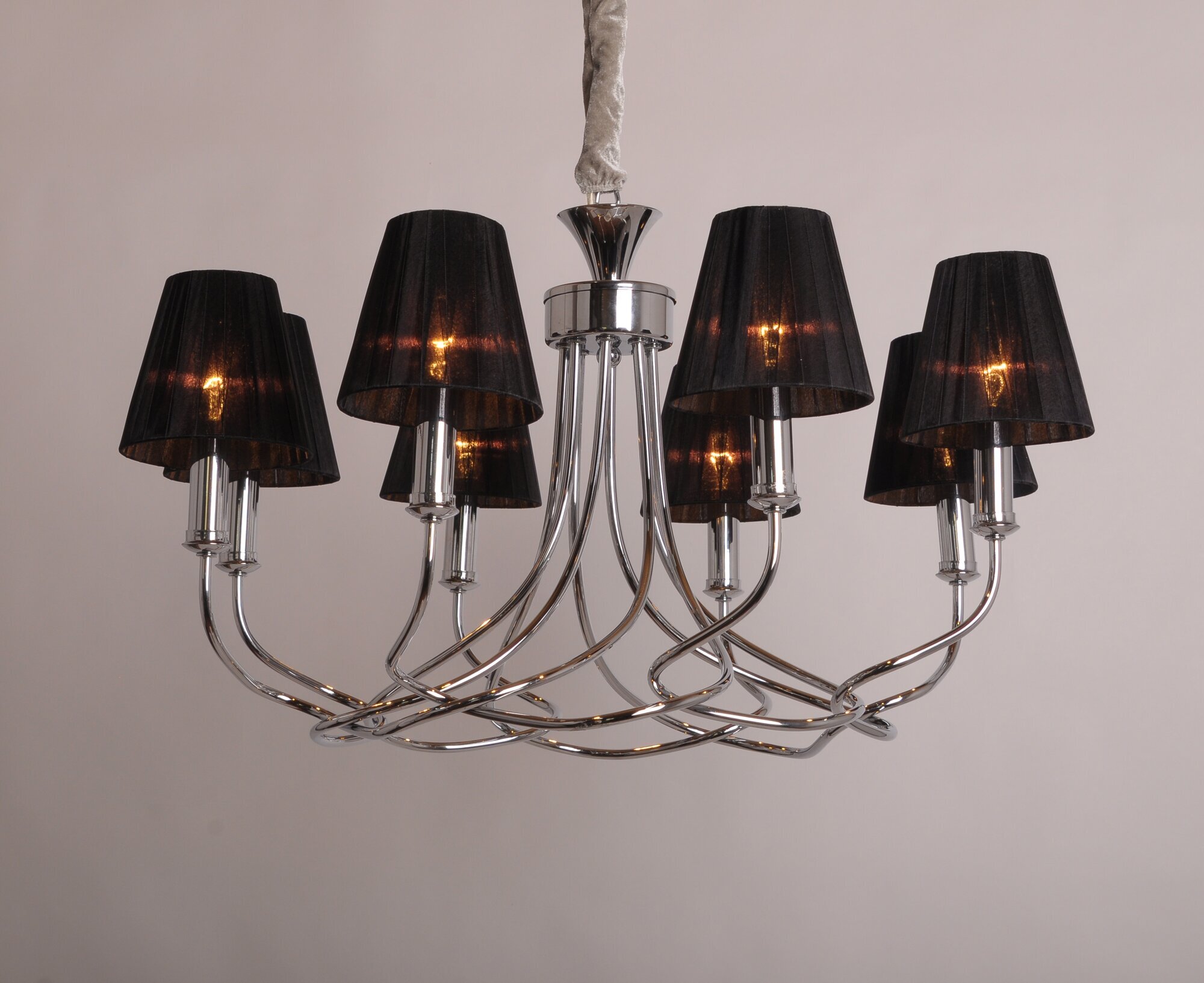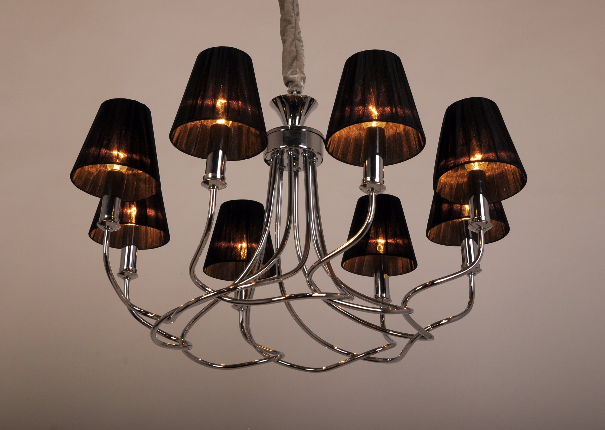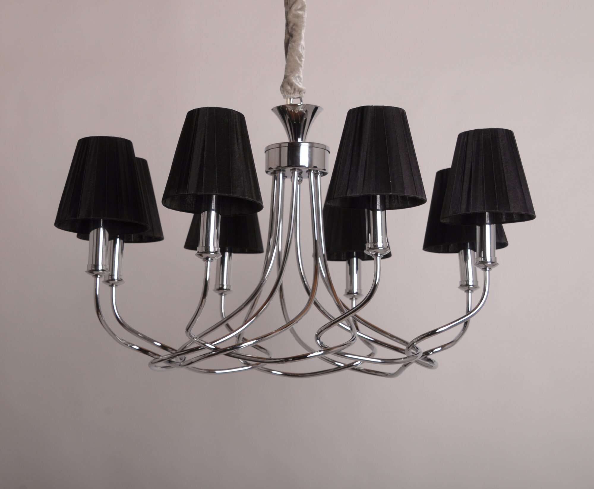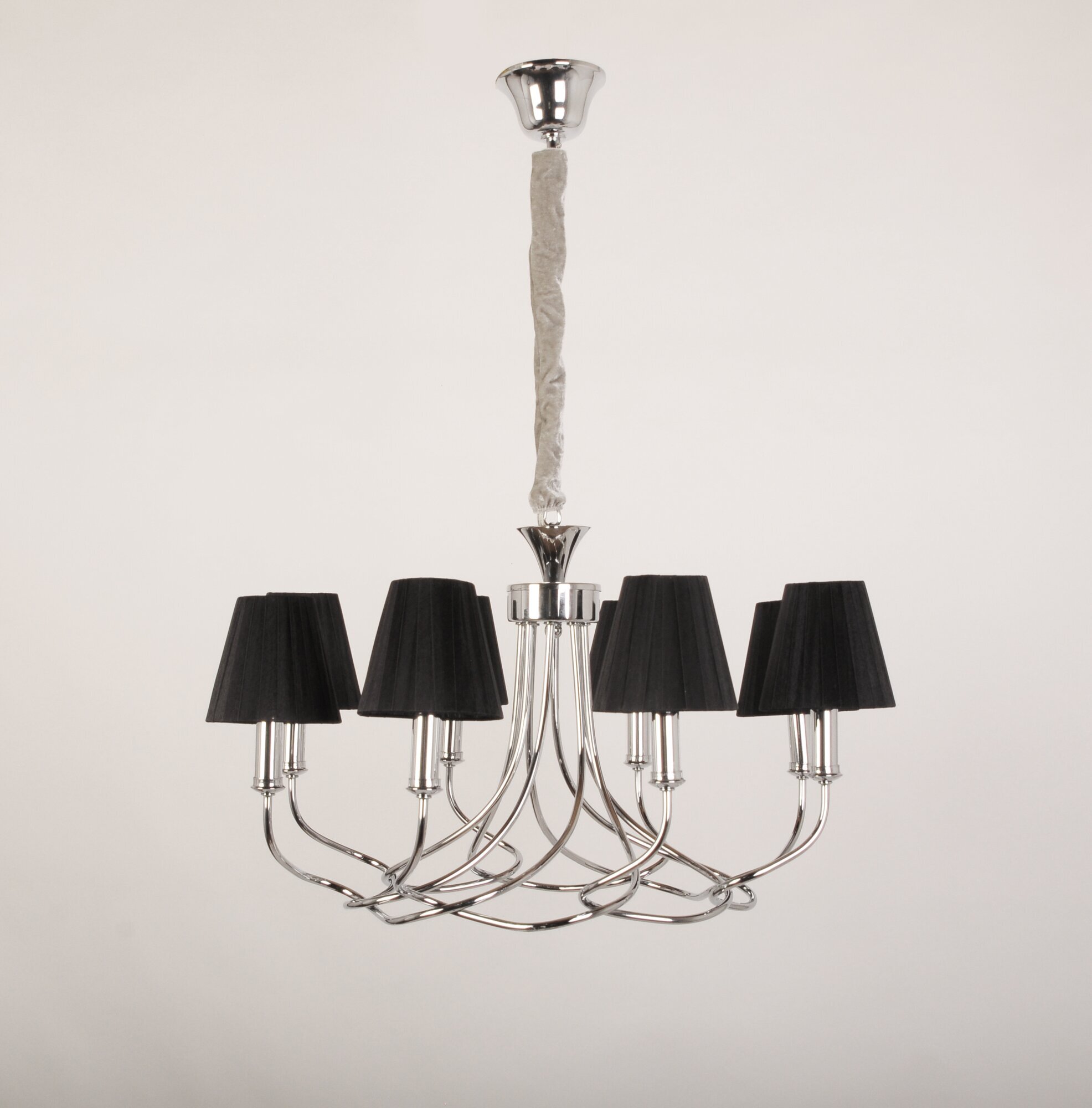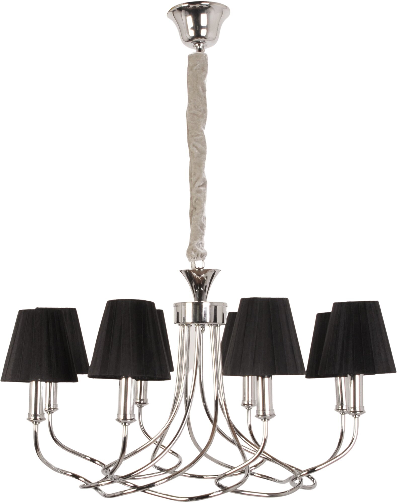 Арматура люстры выполнена из металла с хромированным покрытием, а плафоны - из ткани черного цвета. Форма плафонов коническая, а направление плафонов вниз, что создает уютную и комфортную атмосферу в помещении.