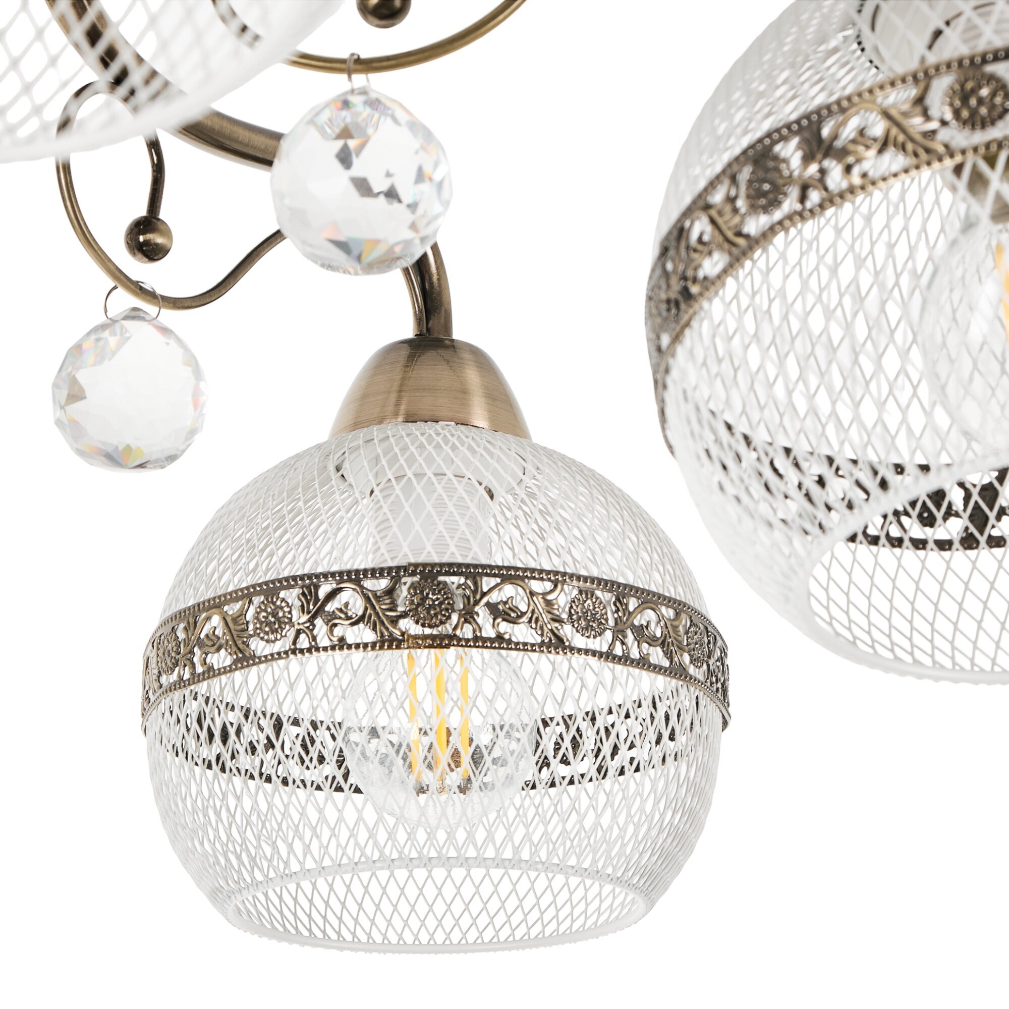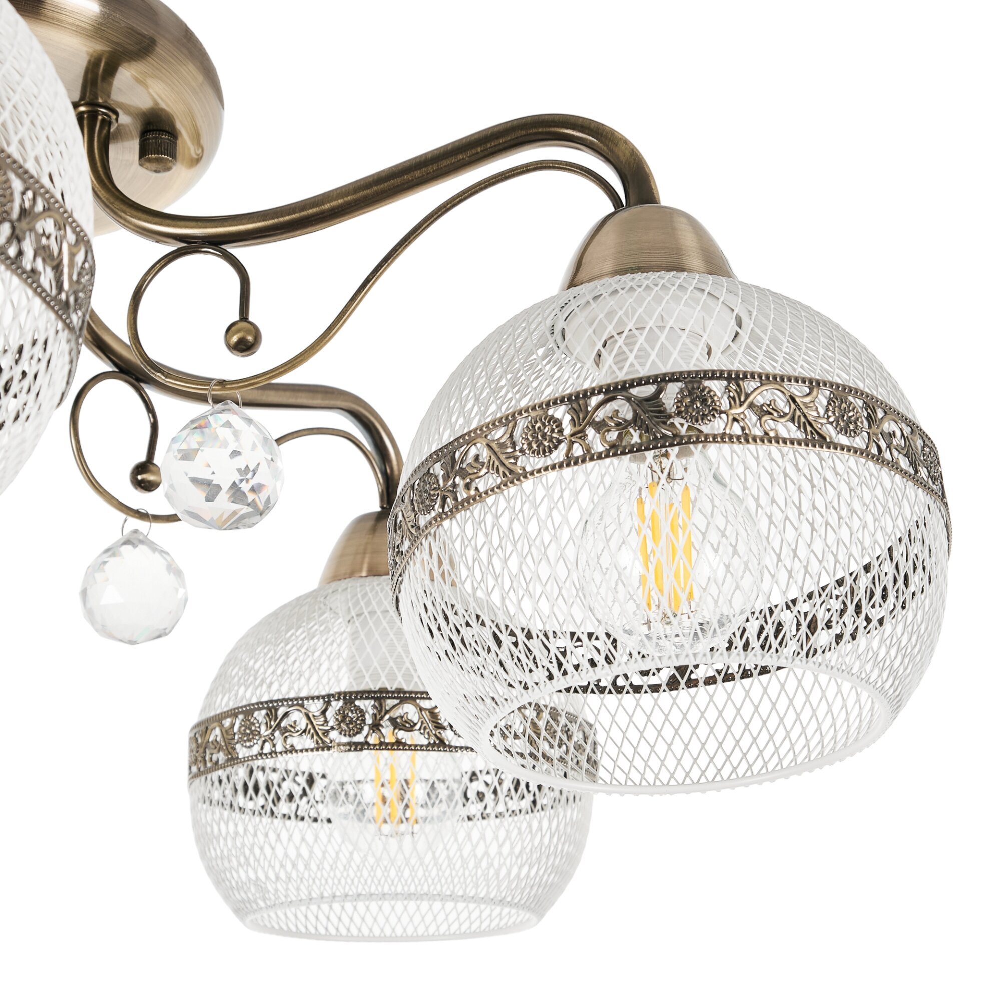 Люстра выполнена в классическом стиле, который прекрасно впишется в интерьер гостиной или спальни. Арматура изготовлена из металла, а плафоны - из стекла, что придает ей элегантный и современный вид. Цвет арматуры - бронзовый, а плафонов - белый.